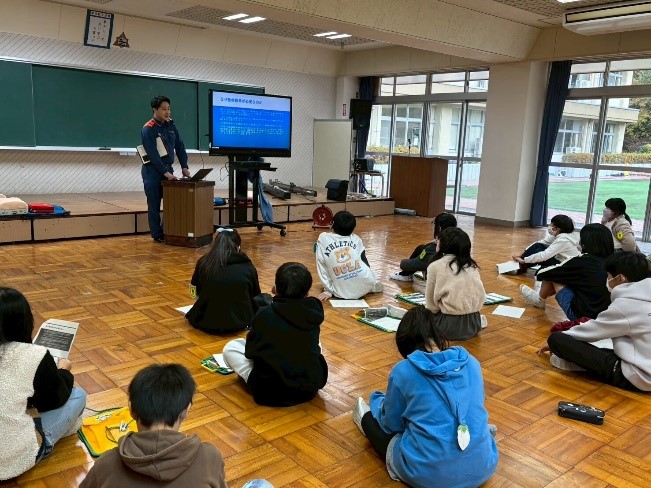 この講習は、同校の総合学習のテーマである「安心・安全な学区づくり」の一環で、万が一の時に小学生の自分たちに何ができるかを考え、実践する態度を養うことを目的に依頼を受け、開催に至りました。